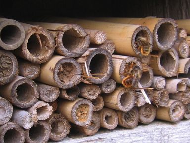 An alternative, shown above, is to stick short lengths of cane or hollow plant stems inside a wooden box – an old bird box with the front removed is ideal.