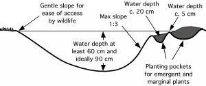 Draw a rough cross-section of the pond to check how much depth you will get for your width. You need at least 60 cm depth for frogs to hibernate successfully, and ideally 90 cm or more. On normal soil, slopes should be 20° max. i.e. roughly 1 unit down for every 3 units across, to avoid the risk of slippage. You can get away with steeper slopes on a stiff clay soil.