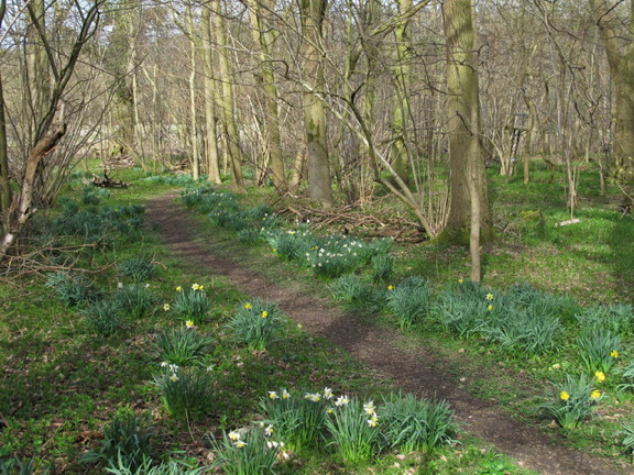 The main wood contains oak, beech, ash and sycamore, with areas of hazel and hornbeam coppice. Spring brings a fine display of oxlips, violets, dog's mercury and herb paris, with a profusion of naturalised daffodils on either side of the central path.