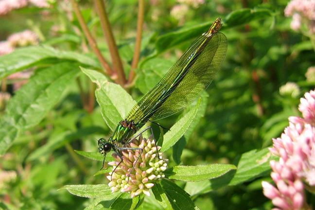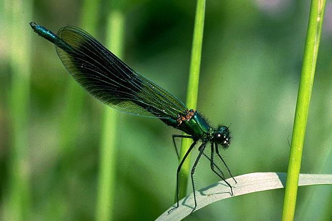 Graceful large damselfly with butterfly-like flight; male has distinctive banded wings