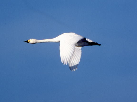 Small white swan; black bill has truncated yellow area at base, concave bill profile; 120 cm