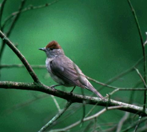 Uniformly grey-toned with distinctive black cap in male, rust in female; 13–15 cm
