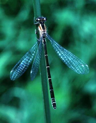 Usually dark with blue stripes on the abdomen and blue tail, but females may be green, orange or violet