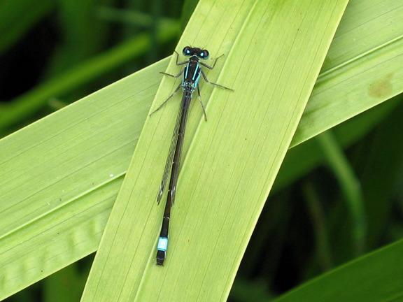 One of Britain's commonest damselflies, usually dark with a blue tail