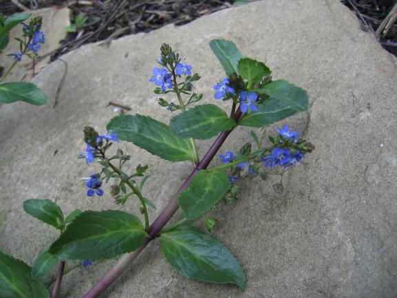 Low, creeping plant with spikes of blue flowers, common on the margins of ponds and streams