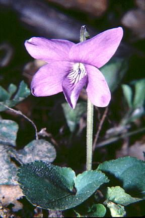 A delicate blue-violet flower with heart-shaped leaves, found on shady hedge-banks and in open woods