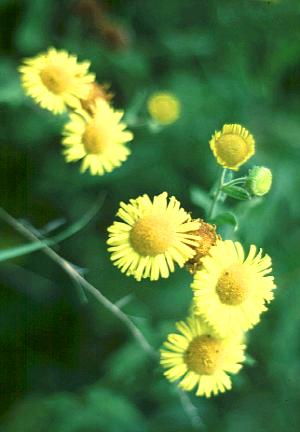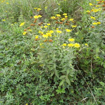 A widespread yellow daisy with wrinkled, downy leaves, flowering in late summer and preferring damp, grassy areas