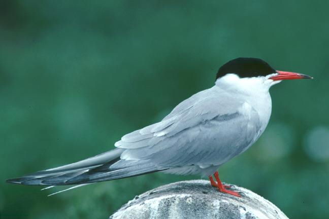 Pale grey upperparts, white below, black cap, red bill with black tip and red legs; 35 cm