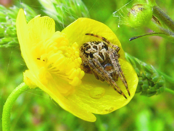 This species sits both on vegetation such as flower heads and on the ground, waiting for prey to come within reach