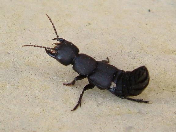 A long thin grey-black beetle, looking and acting like an oversized earwig; length 2.5 cm