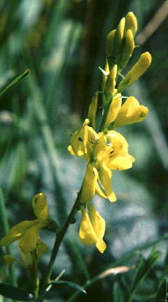 Yellow pea-like flowers cluster near the top of the plant throughout summer, followed by short seed pods