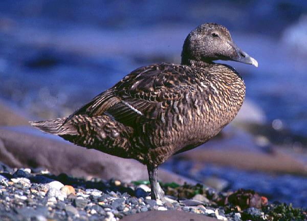 Large stocky seaduck with steep flat forehead, famous for its soft down
