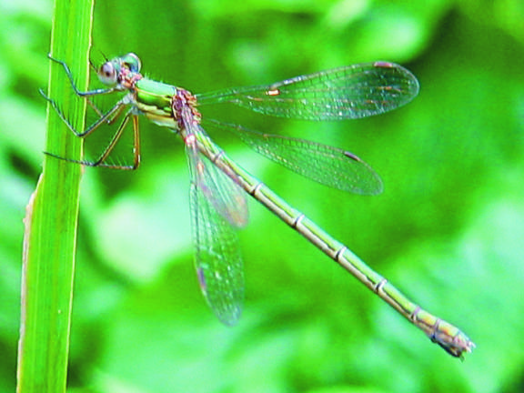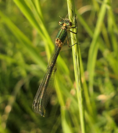 A metallic green damselfly found in dense vegetation around shallow pools and ditches