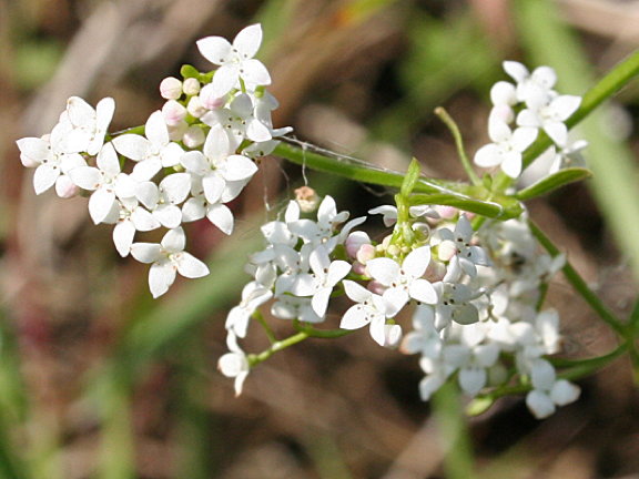 Tiny white flowers with yellow anthers; needle-like leaves are in rings of 6-8 round the stems
