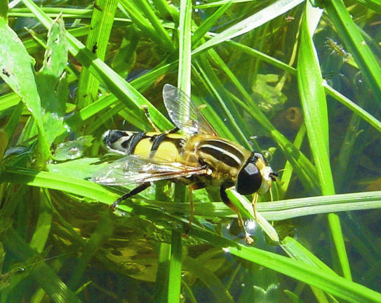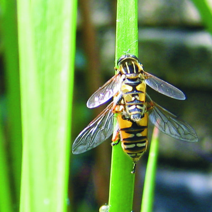 A stripy black and yellow-orange hoverfly, earning it the name 'the footballer'