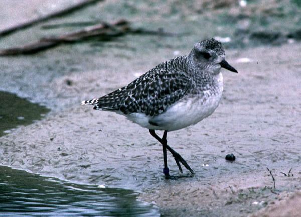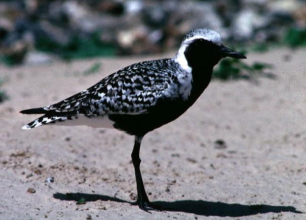 Summer: black below with grey spangled upperparts; winter: grey above and white below; 28 cm
