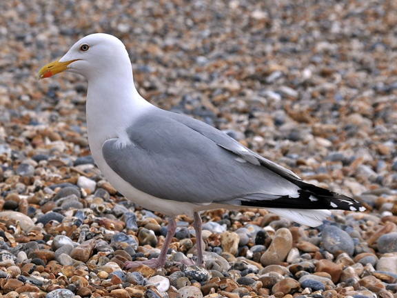 Grey and white above, yellow bill with red spot, pink legs; black wingtips with white 'mirrors' (patches); 55–65 cm