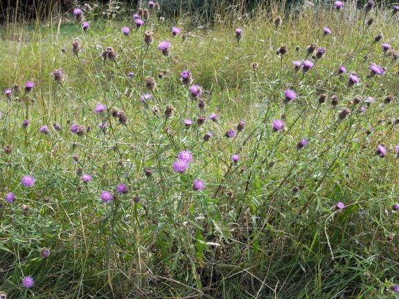 A widespread perennial meadow plant with red-purple thistle-like flowers, growing up to 90 cm tall