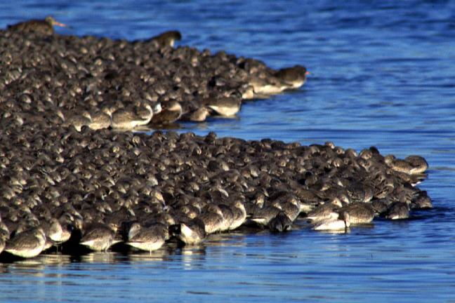 Stocky wader, often forming dense flocks on the mudflats and in flight