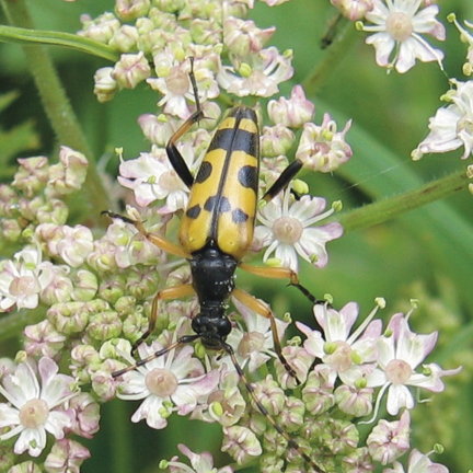 Longhorn beetles are woodland species with long attenae, slender bodies and long legs; they are woodland species
