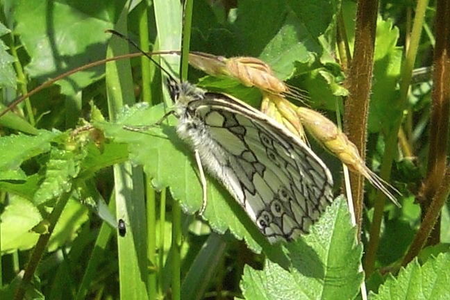 Clear cut black and white chequered pattern on upperwing, less distinct on underwing, which also has eyespots