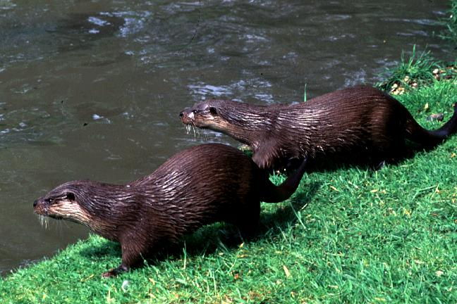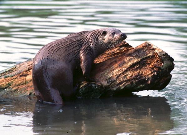 Mainly dark brown animal with blunt nose and tapering tail, superbly adapted to swimming