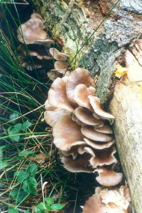 A blue-grey bracket fungus that grows in large clusters on recently dead wood, such as fallen trees