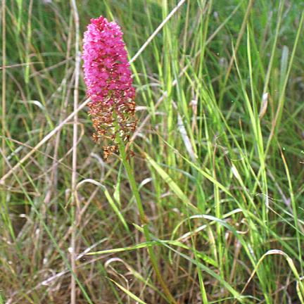 Up to 60cm tall with a spike of 50-100 tightly packed flowers, usually pink but occasionally white