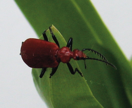 Bright red head and wing-cases; black legs and black comb-like antennae; up to 18mm long