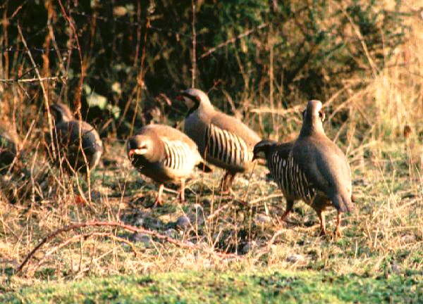Feed in small flocks (coveys) on fields, eating insects, leaves and seeds; often run away if disturbed