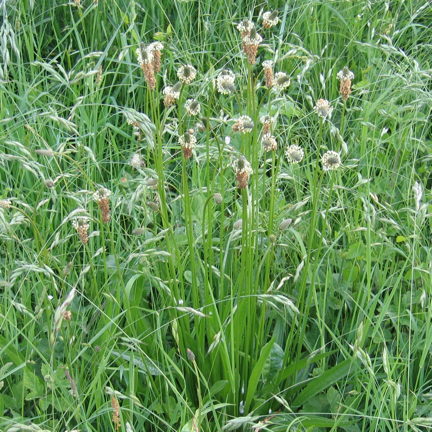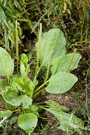 Common plantain has shorter, broader leaves and longer, thinner flower spikes