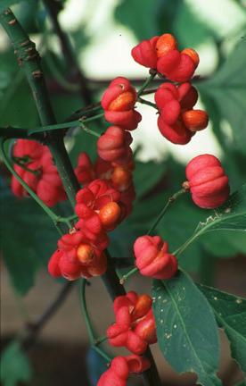 Its small pointed leaves colour purple-red in autumn, when it carries bright pink 4-lobed berries