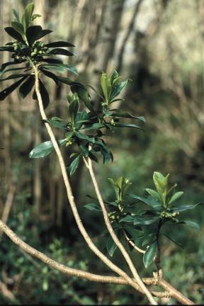 An evergreen shrub with thick glossy leaves, found in open woods on chalky soils, growing up to 1m tall