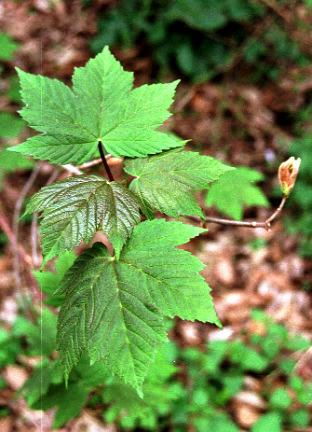 A fast-growing spreading tree with smooth grey bark and 5-lobed leaves