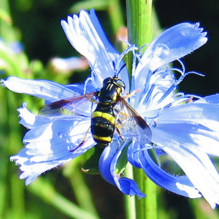 A distinctive hoverfly, with its two broad yellow bands on a black body and chocolate wing patches