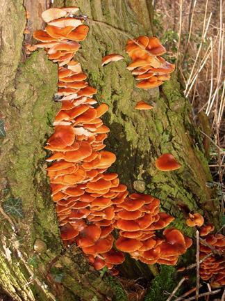 An orange-yellow fungus growing in large clusters on decaying deciduous trees
