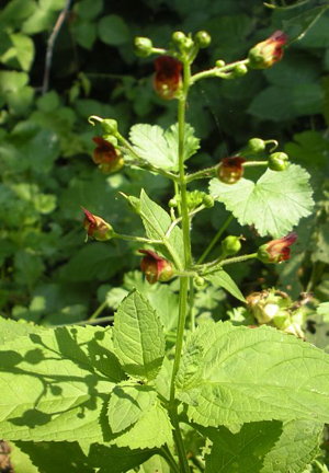 Water figwort is found in damp meadows and on ditch banks; common in woods and along hedgerows