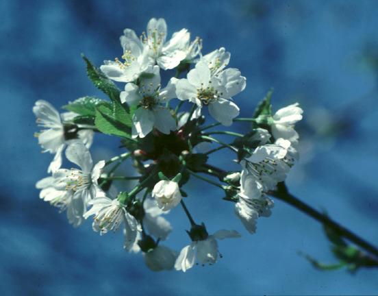 White flowers in loose clusters April to May, followed by small acid fruit, turning from yellow to dark red