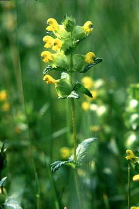A grassland plant with hooded, yellow flowers that is a semi-parasite on grasses